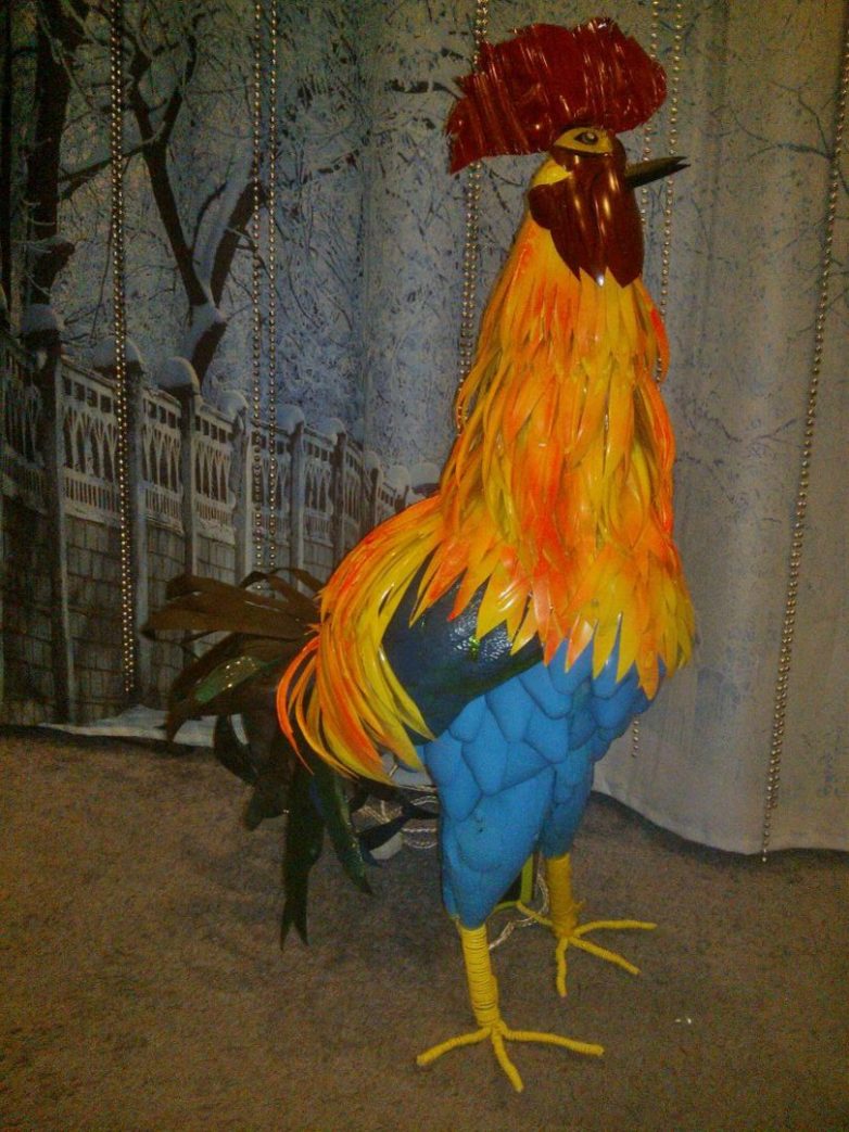 Если решились на поделки, то выбирайте акриловые краски, потому что гуашь смоется после первого же дождя. Для декора используют одноразовые ложки, компактные диски, ткань и даже старую обувь. Кстати, нашла интересную идею в тему на фото. В описании было дано, что это веселая птичка в человеческий рост.