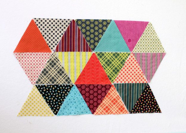 Набор треугольников. Такое декоративное изделие изготавливается из лоскутов ткани разных цветов и фактуры. Из них вырезают одинаковые треугольники и последовательно их сшивают в определённом порядке.