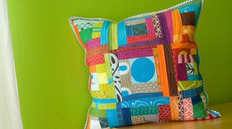 Начинать следует с подготовки материалов и инструментов. Для получения декоративного полотна подушки первоначально подбираются лоскуты разного цвета, оставшиеся после любого шитья. Также необходимо подумать, чем будет заполняться подушка — чаще всего функцию наполнителя выполняет синтепон.