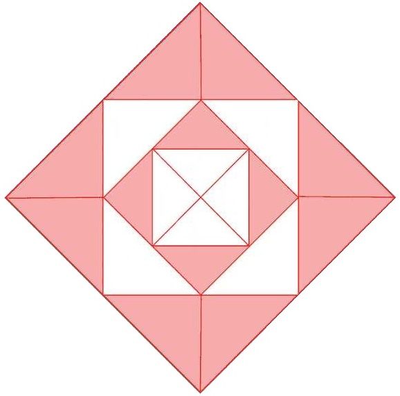 1. Первоначально заготавливаются выкройки. Изделие состоит из квадрата, расположенного в центре изделия. За ним будут следовать 5 полос по периметру, состоящих из четырёх треугольников, полученных из квадрата, разрезанного по диагонали. Центральный квадрат имеет габариты 6,5×6,5 см. Квадраты для треугольников, используемые в каждом этаже, имеют стороны 7 см, 9 см, 11 см соответственно.