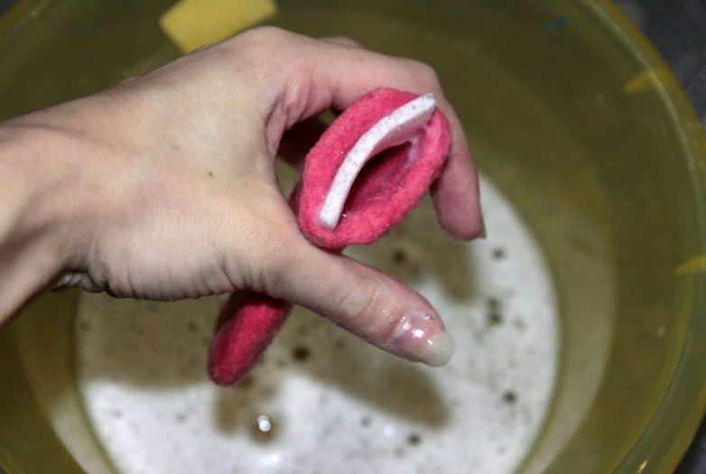 15. Теперь можно смело приступать к валянию. Смачиваем шаблон мыльным раствором, накрываем салфеткой и начинаем тереть. Сначала трите не сильно, затем, когда почувствуете, что шерсть начала сваливаться, работайте в полную силу. Не забываем про боковые стороны заготовки. Валяем примерно 15-20 минут.