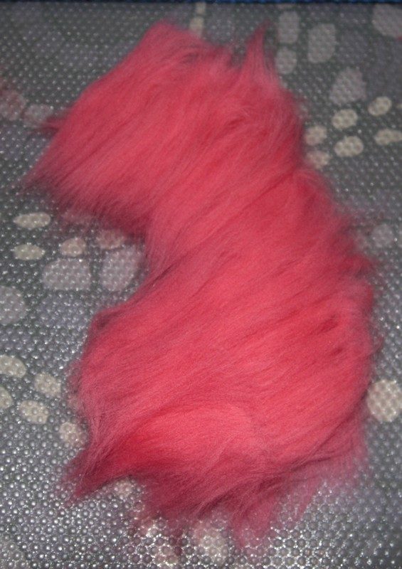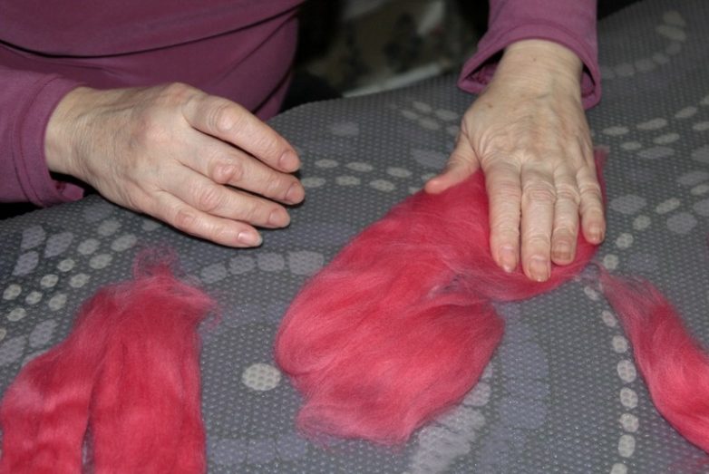 3. Берем в левую руку пасму шерсти, правой рукой зажимаем кончики, прижимая шерсть пальцами к ладони, и вытягиваем. Необходимо именно вытягивать, а не отрывать или дергать, чтобы получилась полупрозрачная пушистая прядь шерсти. Такими прядями мы и будем выкладывать шаблон.