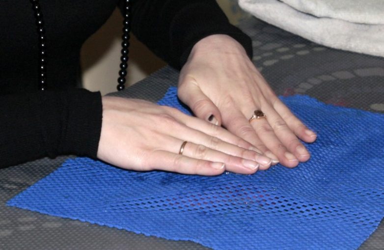 12. Смачиваем мыльным раствором, накрываем салфеткой. Несколько раз прижимаем сверху ладонями.