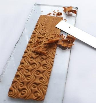 Аккуратно снимаем текстуру и даем пласту глины остыть около получаса. Затем с помощью лезвия срезаем выступающий рисунок. Лучше срезать медленно и по чуть-чуть, чем отрезать лишнего и испортить рисунок.