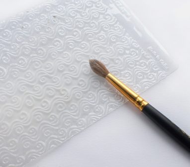 Текстурный лист с помощью кисточки покрываем тонким слоем детской присыпки или талька так, чтобы все углубления были тщательно присыпаны. Можно использовать и воду.