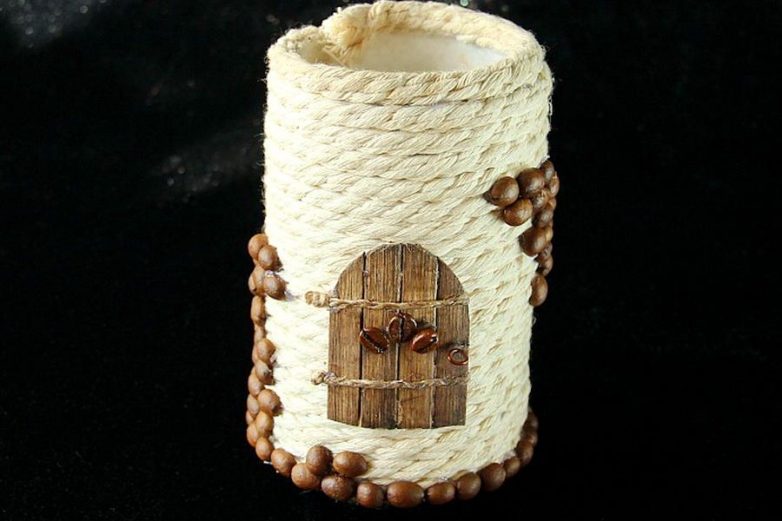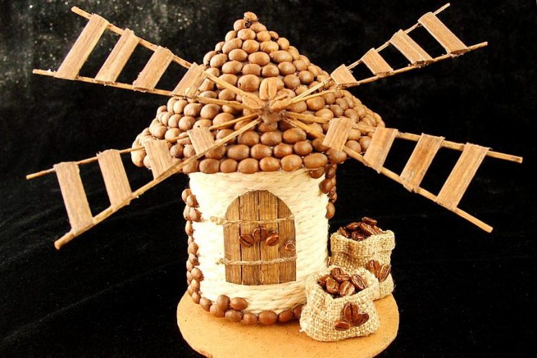 Внутрь можно поместить банку с кофе — получится оригинальный подарок. При желании крышу можно приклеить, и тогда мельница станет декоративной кофейной фигуркой.