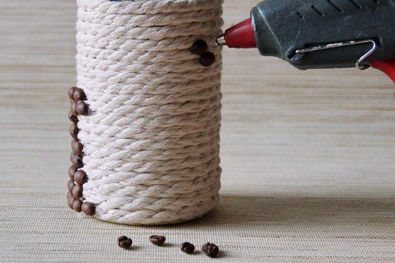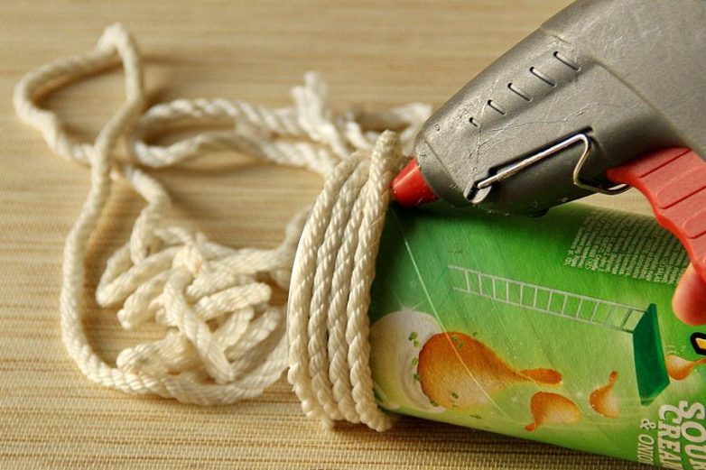 Для этого подходящую коробочку нужно обмотать верёвкой, придавая стенам фактурность. Коробка из-под чипсов была очень высокой, я ее разрезала примерно пополам. Для создания «стен» может подойти и обыкновенная пластиковая бутылка.