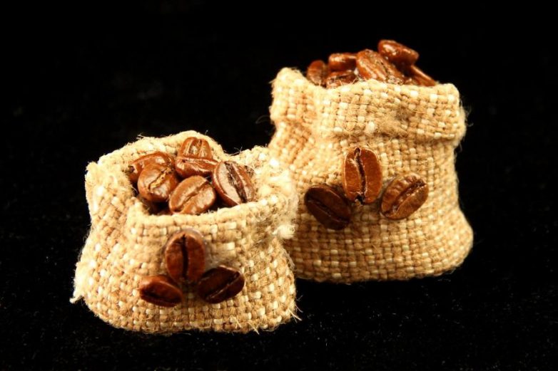 На дно мешочка можно положить кусочек бумаги, ваты или ткани, а сверху приклеить кофейные зерна. Сам мешочек так же декорируем кофейными зернами и покрываем лаком.