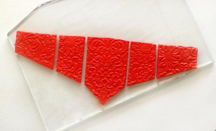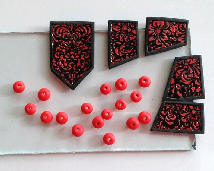 Отправляем детали запекаться. Можно попробовать обходится без промежуточных запеканий, но тогда можно нечаянно смазать рисунок и украшение получится не таким аккуратным. Когда элементы остыли, выкладываем их на пласт черной глины, толщина которого должна быть немного больше толщины красных деталей.