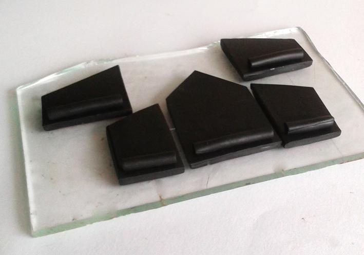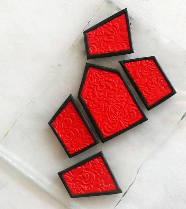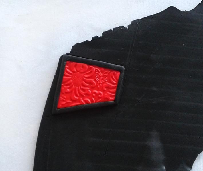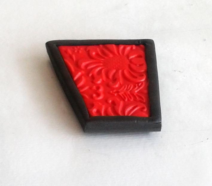 На тонкий пласт черной глины выкладываем красный элемент с черной рамочкой и обрезаем по контуру.