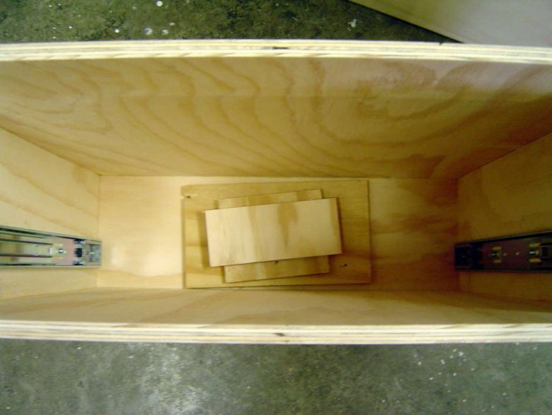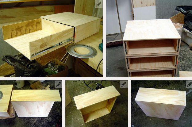 4. Изготовьте три ящика без верхней и передней стенки. Ящики должны свободно входить внутрь секций. Нижнюю и заднюю стенки можно изготовить из 8-миллиметровой фанеры, боковые — из 12-миллиметровой. Заполните пустоты замазкой и ошкурьте.