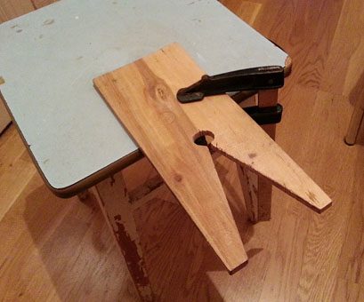 Если у вас нет фиксатора, его легко сделать из фанеры, толщиной миллиметров девять (более тонкая будет пружинить, толстая — сократит ход лобзика). Отрезаем прямоугольный кусок фанеры примерно 12×30 см, сверлим дырку диаметром где-то в два сантиметра по центру, потом ножовкой выпиливаем уголок. Фиксатор готов.
