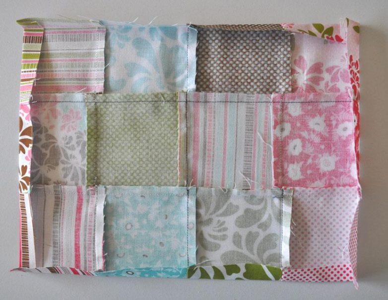 Возьмите 8-сантиметровые квадраты и сшейте их, чтобы получить лоскутную подушечку.