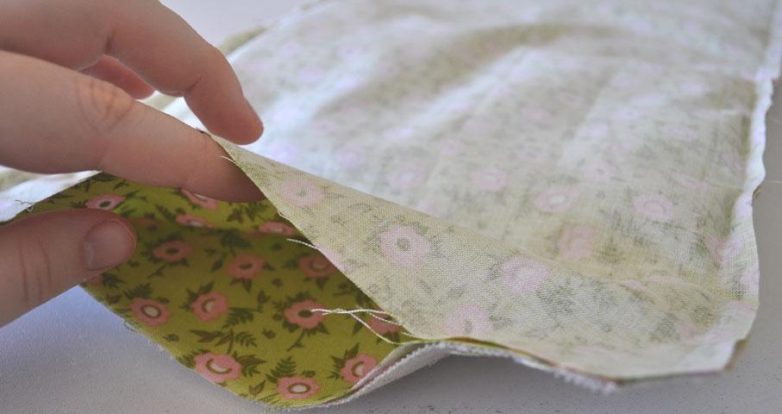 Оставьте лоскутный кусок на время в стороне и возьмите квадратный отрезок для кармана. Отрежьте с одной стороны 1-2 сантиметра и сложите блок пополам разными сторонами друг к другу. Вдоль свернутого края, отступив 0,5 см, простейгайте произвольным образом.