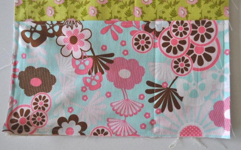 Теперь возьмите обрезки плотной и фоновой ткани, а также карман. Положите их на стол, как показано на рисунке. Простегайте вокруг внешнего края кармана.