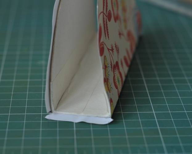 Припуск приклеиваем на внутреннюю часть салфетницы. После этого аналогично подрезаем боковые части «обожки». Кладем салфетницу на бок, делаем прямой надрез от линии сгиба, и отступив 3-4 мм от края, завершаем треугольным надрезом.