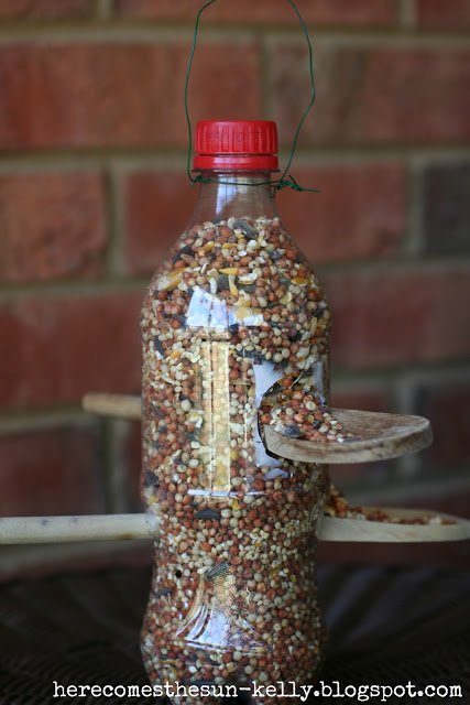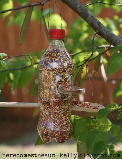 1. Самая неприхотливая кормушка, которую можно сделать из использованной пластиковой бутылки.