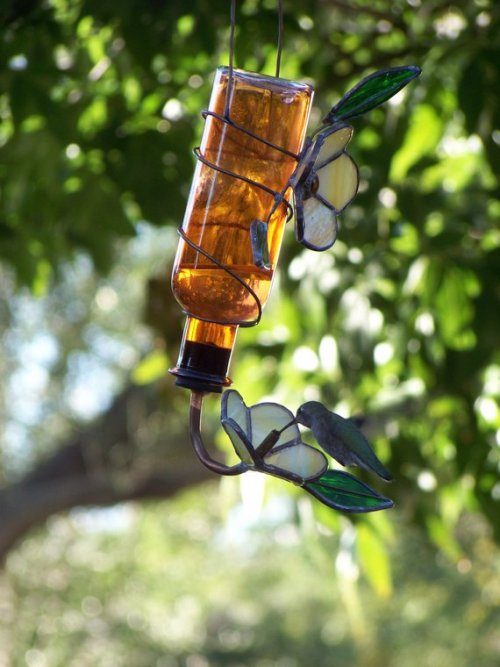 9. Кормушка для колибри: стеклянная бутылка обмотана медной проволокой и декорирована цветками и бабочками