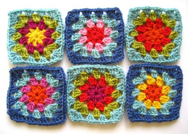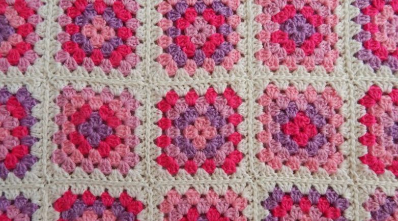 Так мы получили небольшой квадратик для будущего вязаного пледа, остается только обвязать его столбиками без накида. Для этого сделайте 2 ВП для подъема плюс столбик без накида под воздушные петли, а в углу проделайте 5 СБН (или 3 ССН в зависимости от типа выбранной картинки бабушкиного квадрата). Подобным образом делаем оставшиеся квадраты и приступаем к завершающему этапу – соединению деталей в полноценное изделие.