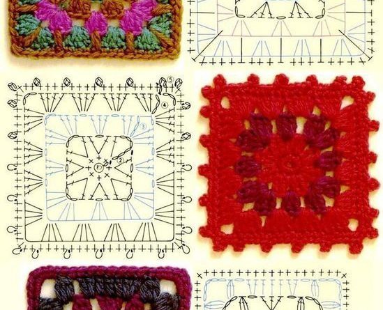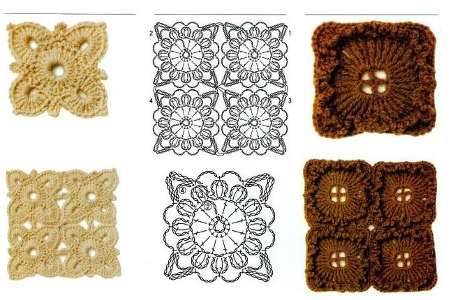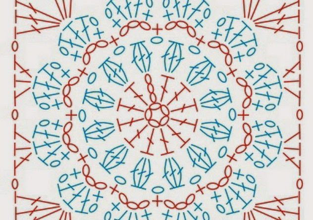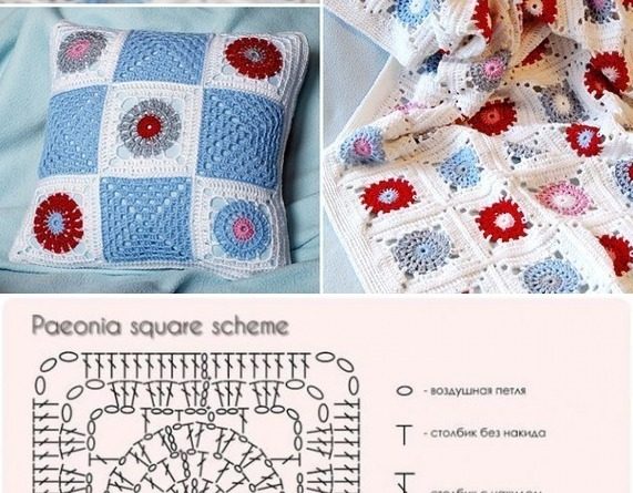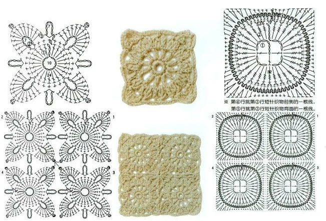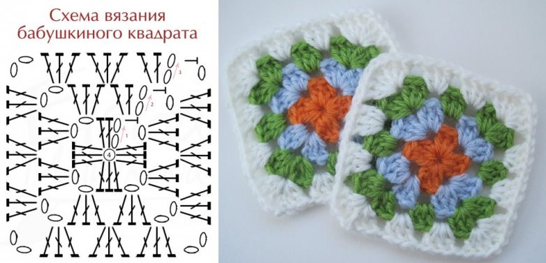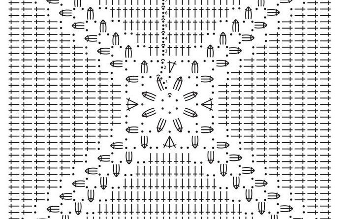 Ниже на фото вы можете видеть готовый вязаный квадрат крючком и схему к нему, с помощью которой вы легко воплотите в жизнь этот шедевр.