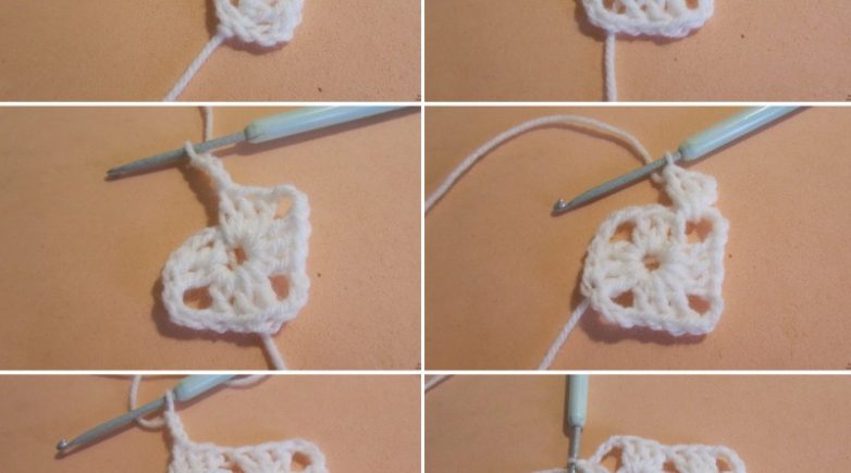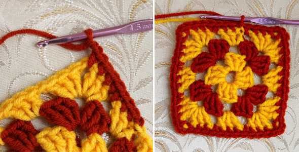 В завершение нужно перевернуть связанный кусок и повторять те же действия до получения квадратного мотива. При вязании по кругу первые несколько петель замыкают в кольцо и делают несколько столбиков с накидом по спирали. В результате получаются аккуратные квадратные элементы с одинаковым количеством рядов на углах квадрата.