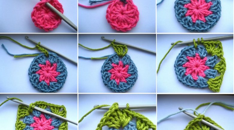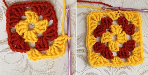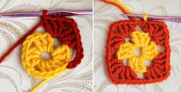 Выше на фото показан метод провязывания соединительных столбиков. Он необходим для правильного формирования классического бабушкиного квадрата. Этот момент также важен, как и прикрепление нити другого цвета, о котором мы расскажем далее.