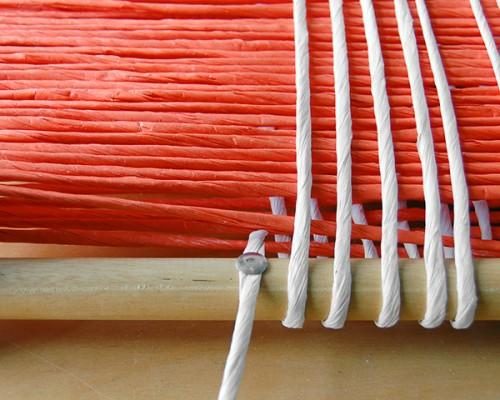 Теперь нужно вплести шнур в основные нити. Мы использовали схему 3 сверху, 3 снизу, но вы можете выбрать схемы 1/3, 2/2, или 5/4.