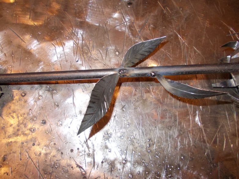 Отступите 2 см от конца прута. Теперь оденьте на него заготовки с лепестками, начиная с чашелистика. Располагайте каждый слой лепестков так, чтобы лепестки располагались крест-накрест. Закрепляйте каждый слой сваркой. Осторожно — тонкий металл быстро прогорает, поэтому плавьте больше прут, чем лепестки.
