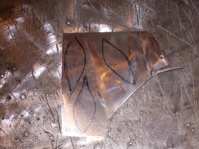 Теперь нужно сделать листья розы. Нарисуйте их контуры на металлическом листе. Они тоже могут быть не одинаковыми.