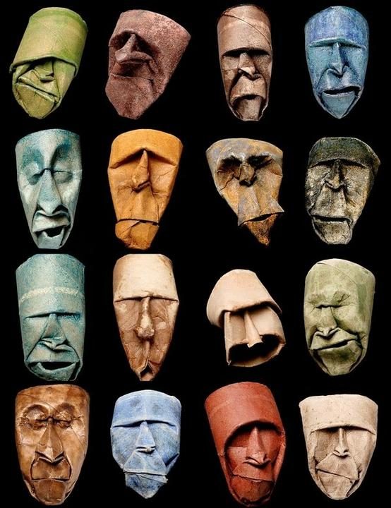 Впрочем, спички далеко не самый неожиданный материал для самовыражения. Художник из Парижа Фриц Джуниор Жаке перешел от обычного оригами к созданию экспрессивных лиц из картонных цилиндров для туалетной бумаги. Автор мнет и красит картон так, что в результате получаются ярко выраженные человеческие эмоции.