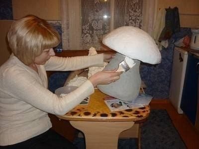 Шляпку следует посадить на ножку при помощи четырёх гвоздей и монтажной пены. Форму грибу придаём обыкновенным канцелярским ножом.
