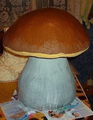 В конце работы обязательно нанести лак. Декор в виде белого гриба для участка готов!