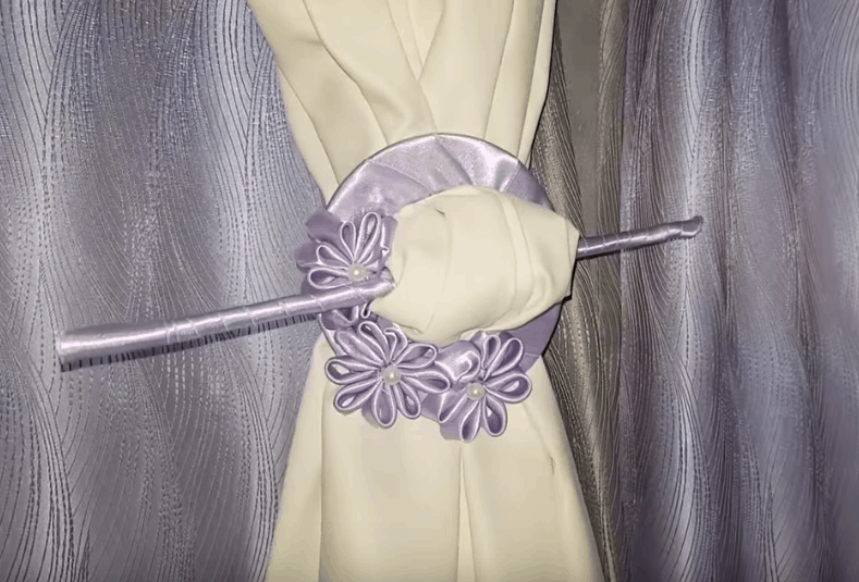Конструкция предельно проста. Используя ее легко перемещать держатель и моделировать полотно. По этому принципу можно сделать прихватки для штор с различными вариантами декора.