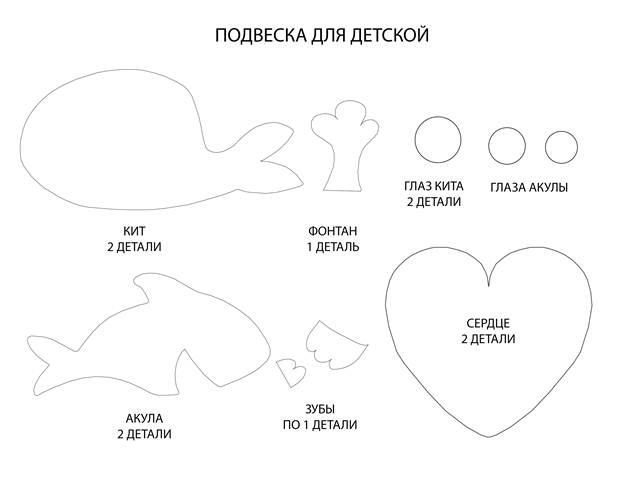 Распечатываем шаблон и выкраиваем детали из фетра. При желании, можно дополнить их парой плавников, хотя это и не обязательно.
