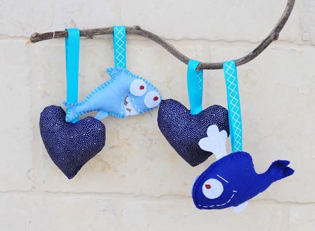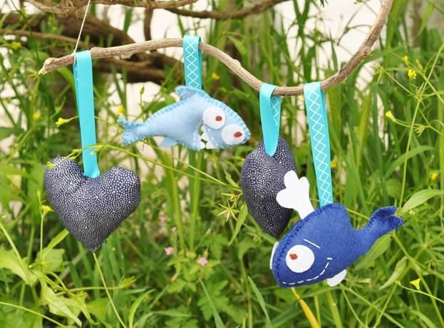 Темой для подвески или мобиля в детскую может стать все, что угодно: птички, рыбы, цветы, звезды, всевозможные зверушки, фрукты и овощи. Также, ничто не мешает вам сшить любое количество предметов, в зависимости от того, какой длины вы подобрали веточку. Я предлагаю для начала сшить пару сердечка из хлопка с мелким рисунком в синей цветовой гамме и две фигурки из фетра: веселую акулу и кита.