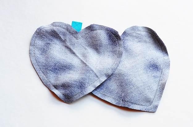В местах сгибов делаем ножницами небольшие надрезы, чтобы у готовых сердечек не появились некрасивые залом и складки. После этого через отверстие выворачиваем сердечки и максимально плотно набиваем их. Отверстие вручную закрывая потайным швом (делаем мелкие стежки на каждом из краев и туго затягиваем нитку).