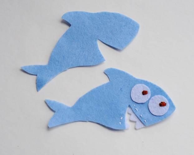 Акуле также вышиваем глазки. При желании, к лицевой части парой мелких стежков можно сразу пришить зубы.