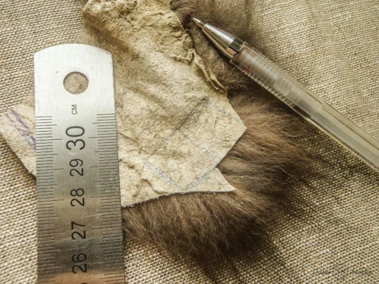 Сперва берем меховой лоскуток, переворачиваем ворсом вниз. Рисуем два прямоугольника, примерно полтора сантиметра в ширину и два в длину.