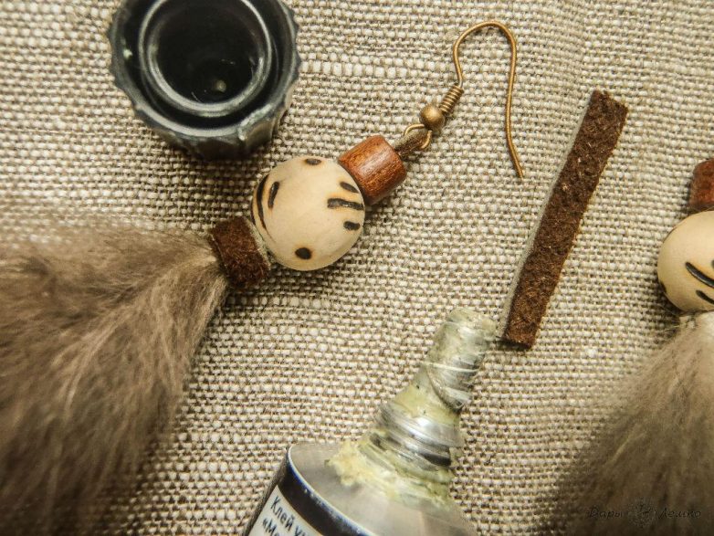 Все то же самое с кожаной полоской, бусинами и швензой проделываем еще раз. И вот у нас есть две заготовки и два кусочка меха, самое время их соединить. Хвостики, которые торчат из бусин, смазываем клеем и прикладываем к меху, примерно посередине, бусинку вплотную к верхней кромке.