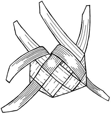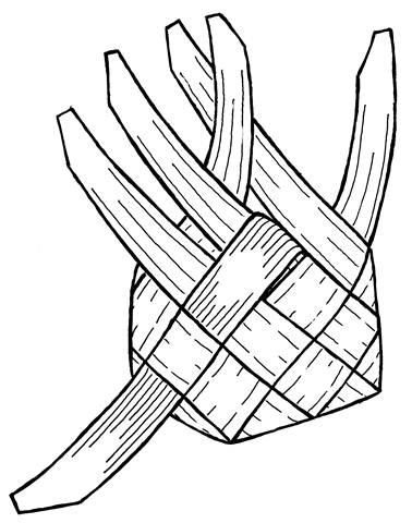 На рис. 2 видно, что угол А у солонки сформирован переплетением в шахматном порядке лычек 1 и 2 с лычками 3 и 4. При этом дно осталось нетронутым, а лычка 2 переплелась с лычками 3 и 4 поочерёдно, затем лычка 1 переплелась с лычками 3 и 4. Пересечение лычек 4 и 1 зафиксируйте дополнительной скрепкой.