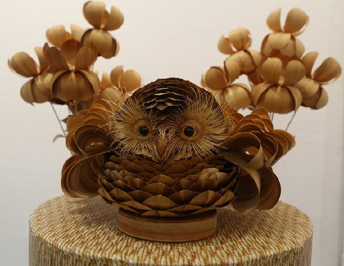 Правильно снятая с брусьев стружка, очень пластична, фактурна, хорошо поддается обработке, ей легко придать нужную форму и объем. К тому же она долговечна и разнообразна в оттенках, что позволяет получить наиболее точное воспроизведение меха животных и оперения птиц.