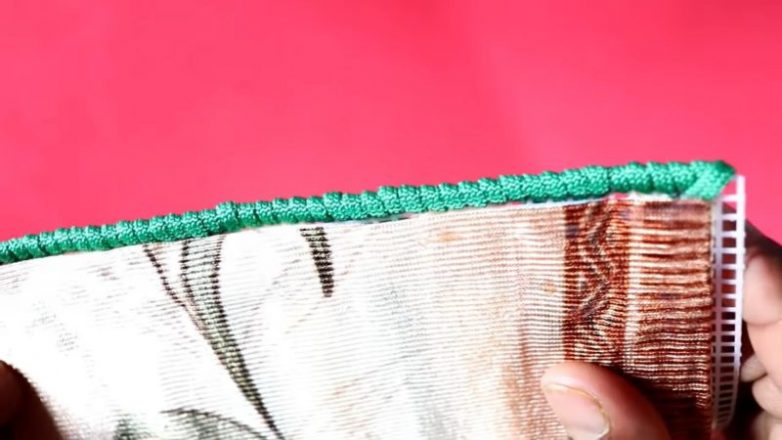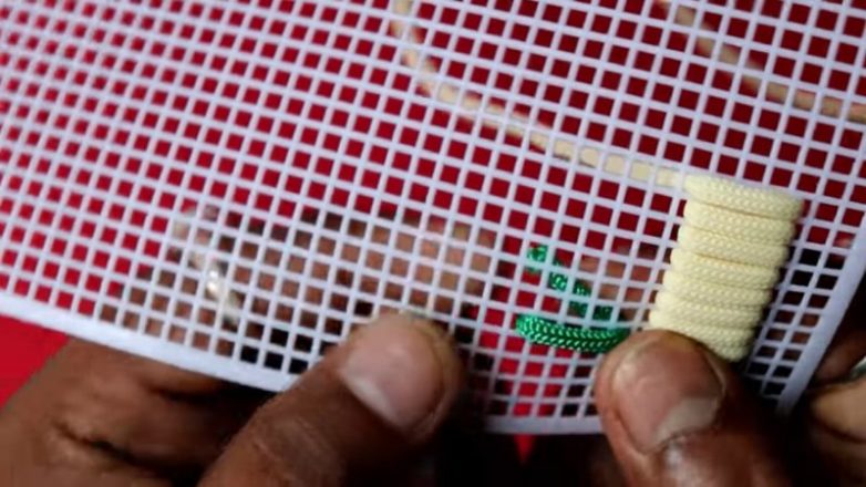 1. На пластиковой канве продеваем шнур через 5 отсеков. Заполняем первый ряд.