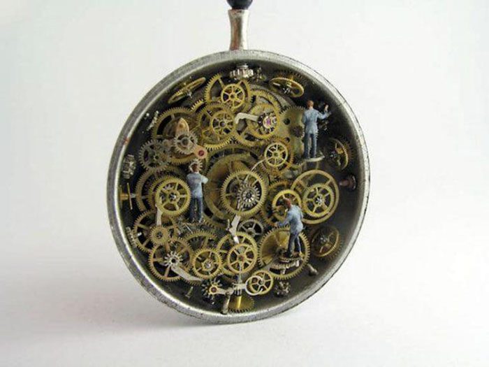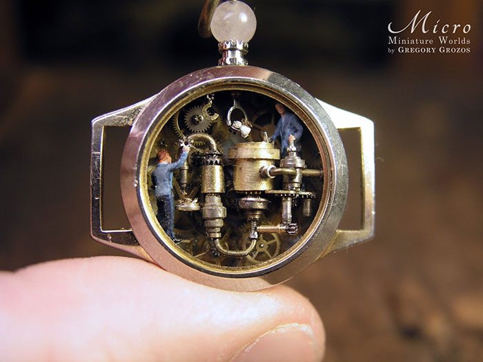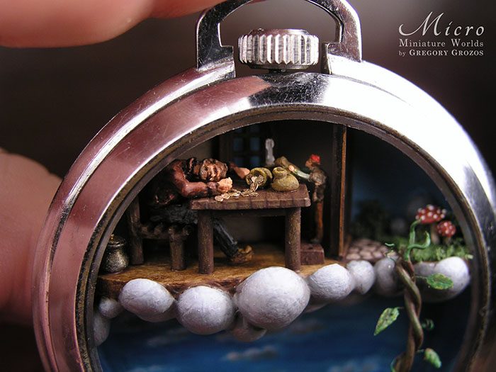 Грегори Грозос (Gregory Grozos) начал экспериментировать с крохотными мирами всего несколько лет назад и начал он как раз с размещением сценки внутри часов. Сейчас он использует и другие материалы под основу — кристаллы, украшения, даже просто крохотные деревянные рамки. Но началось все именно с карманных часов. Удалив из них все механическое устройство, Грегори использовал корпус винтажных часов как рамку для нового мира.