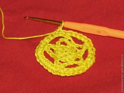 Затем обвязать новыми лепестками весь круг и повторить это, закрепляя воздушную цепочку в петлях верхушек вновь связанных лепестков.