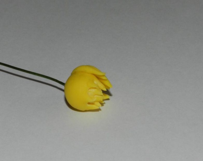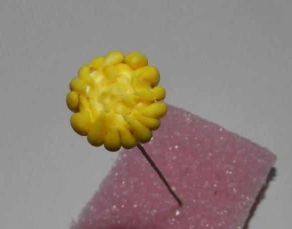 Из желтой глины формируем небольшие колбаски такой длины, чтобы они могли сравнятся по высоте с шариком. Это будут нераспустившиеся лепестки георгина. Крепим их по всей окружности шарика, промазав клеем нижнюю треть полоски.