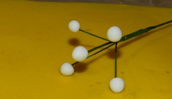 Возьмите проволоку № 24, подойдет даже № 26. Один отрезок будет основным, самым длинным, примерно, сантиметров 30. К нему с помощью флористической ленты прикрепите еще четыре небольших отрезка, примерно, сантиметров по 12 каждый. На концах проволочных веточек сделайте небольшие петельки.