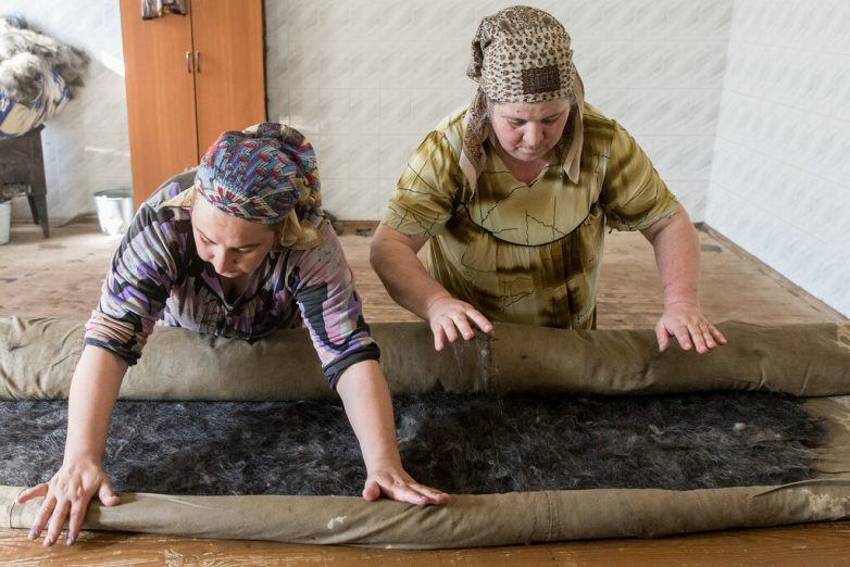 По комнате летает пух. У самого воздуха привкус овчины. Я закашливаюсь, и заместитель директора Али Магомедов со смехом говорит: — Ничего, это лечебный запах! Будущую бурку сбрызгивают кипятком при помощи обычного веника. Три-четыре женщины в черных налокотниках сворачивают ее вокруг специального валика, кладут на стол и катают, налегая предплечьями и синхронно прихлопывая, целый час, пока шерсть не сваляется.