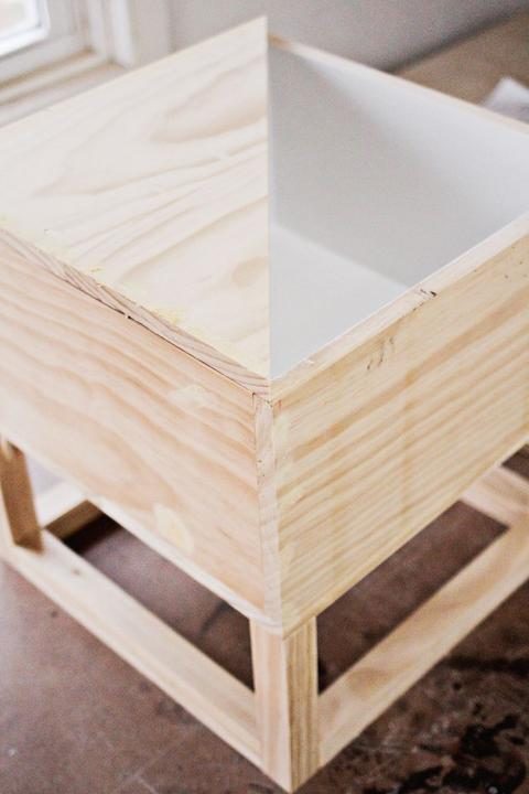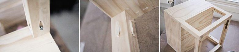 Пока ножки сохнут, можно заняться изготовлением ящика. Ящик изготавливается из четырех дощечек 22,5×45 см и двух дощечек 22,5×41 см. Соединить детали можно с помощью столярного клея и нейлера.