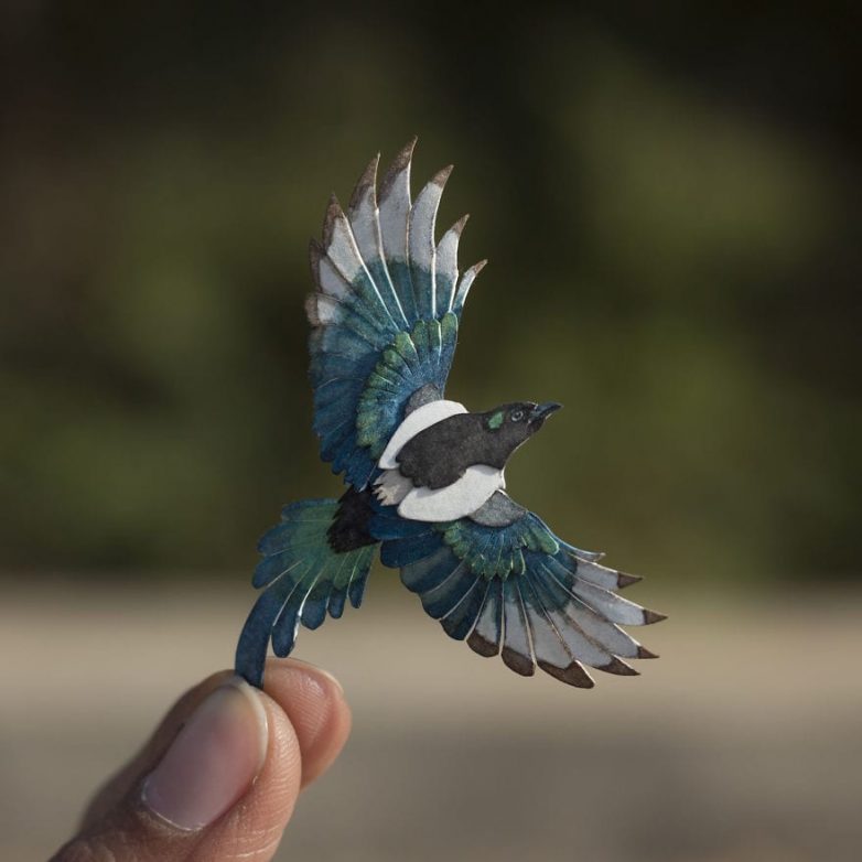 Они используют многослойную бумагу, чтобы придать фигуркам объем.Все птички ручной работы и также вручную раскрашены. При этом лупу в работе пара не использует. Каждый слой вырезается и раскрашивается отдельно. Оттенки соответствуют оперению птиц в реальности. В среднем на одну миниатюру тратится от четырех до восьми часов. Самые крошечные экземпляры не достигают в высоту и двух сантиметров.