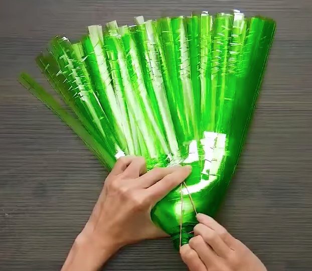 Для начала отрежьте у нескольких бутылок донышко и горлышко, а нижнюю часть разрежьте на тоненькие ленточки, не доходя до края. Чем тоньше вы будете резать, тем мягче будет метла. Если хотите сделать более жесткую — делайте полоски от 2 см. Верхняя бутылка будет держать конструкцию, поэтому на ней следует оставить горлышко. Соберите все бутылки одна в одну, при необходимости подрезая лишний пластик. Шилом пробейте несколько дырочек в стенках и пропустите в них проволоку. Таким образом, все уровни будут скреплены между собой. Осталось закрепить черенок, и можно начинать уборку.